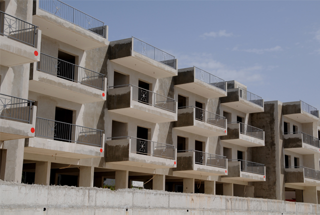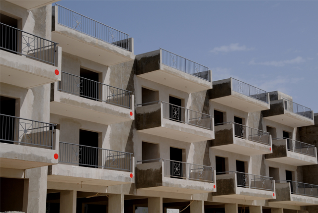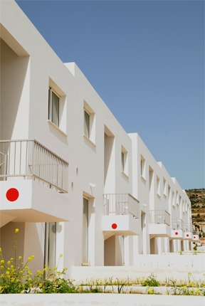 Her exploration in the current architec- tural aesthetics, bringing about abrupt and overwhelming changes in the Cypri- ot urban and rural landscape, is photo- graphically documented in illuminated boxes, alluding to advertising boards, where blocks of apartments, target- ing the influx of foreigners, are being marked as “sold”. This mushrooming of mass buildings is accompanied by an endless multiplication of red dots, the re- sult not of a digital processing, but of a site-specific act, performed by the artist herself, who has actually placed them on facades, walls and verandas, in accor- dance with space proportions, aiming at puzzling the passer-by at the sight of a city, suffering from chicken-pox and con- sequently entrapping its inhabitants in cells of isolation or box installations, frac- turing their personality, smashing their childhood memories and visions.