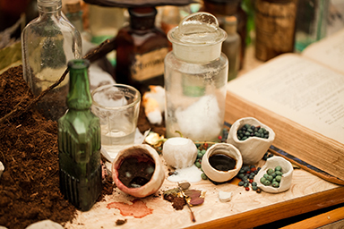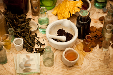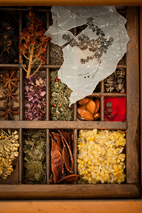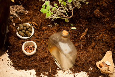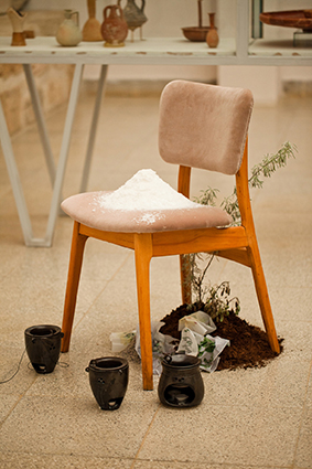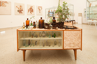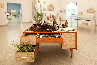 The Minerals and herbals riches of Cyprus, is not just a matter of personal memory related to the deeply rooted therapeutic traditions of the island. She characterized her exhibit as a ''chaotic corner'' of a craftsman / alchemist's working bench, which through the use of miraculous herbs and therapeutic metals seeks not just the elixir for the health and longevity, but also a way to deeper redefine man's relationship with nature. The work is an installation (furniture/object), with different levels and incorporated casings intended to welcome the ores and herbs of the Cypriot island. Along with these natural materials, multiple pharmaceutical bottles which are salvaged from the Ottoman years but also from the period of the British Colonization, in different sizes colours, are a main element of the installation. These are the indications or collective testimonies of imported pharmaceutical substances from countries, mostly England, but also Spain which have developed relations with Cyprus in the medical and pharmaceutical field. For Marianna Constanti, the pharmaceutical vessels are the ''bodies'' which bear, or once before, the medicine/elixir for the rehabilitation of health, but they also function as a basic element of an ambiguous artistic construction which variably stimulates the human senses ( vision, smell, touch).